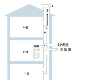 每戶的煙道開口,也就是逆止閥的位置,應該比主煙道上的低,因為煙氣都是往上流動的,所以主煙道的氣味很少會進入支煙道里面,也就不會出現串味的現象了。